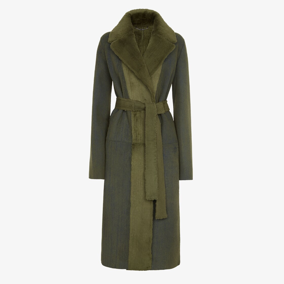 معطف طويل يلتفّ حول الجسم مع حزام متناسق. رقبة بطيّات، وجيوب جانبية، وفتحة في وسط الجهة الخلفية. مصنوع من جلد الغنم باللون الأخضر الداكن. يتميز بتأثير نسيج خاص يمنحه ملمساً فريداً.
