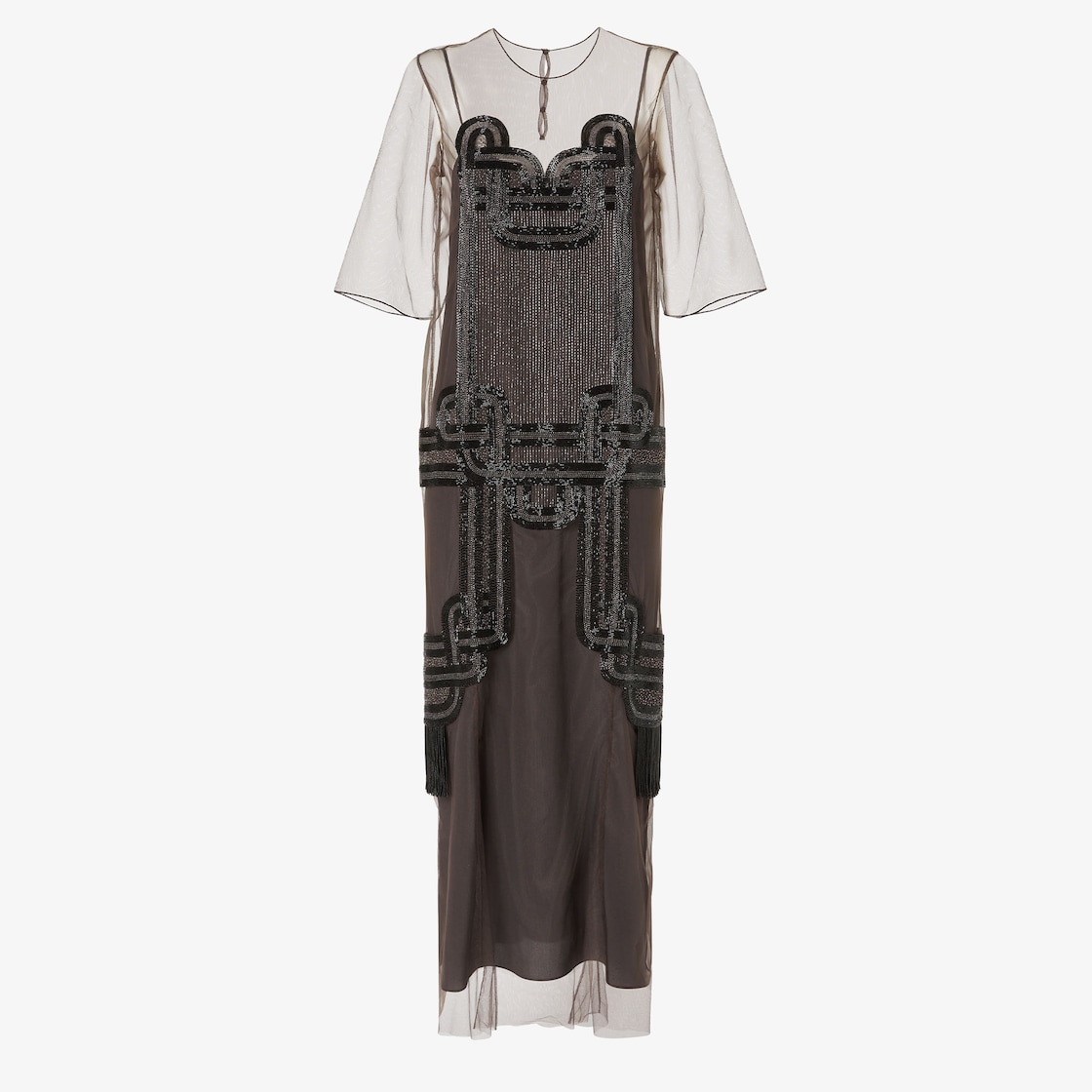 فستان طويل بقصّة مستقيمة. رقبة مدوّرة وأكمام قصيرة. يغلق بثلاثة أزرار صغيرة في الجهة الخلفية. مصنوع من التول (tulle) خفيف الوزن باللون الأسود. مزين بعلامة هندسية مستوحاة من الآرت ديكو مطرزة يدوياً بالخرز العادي والزجاجي، مع لمسة نهائية شرائط صغيرة على الجانبين.