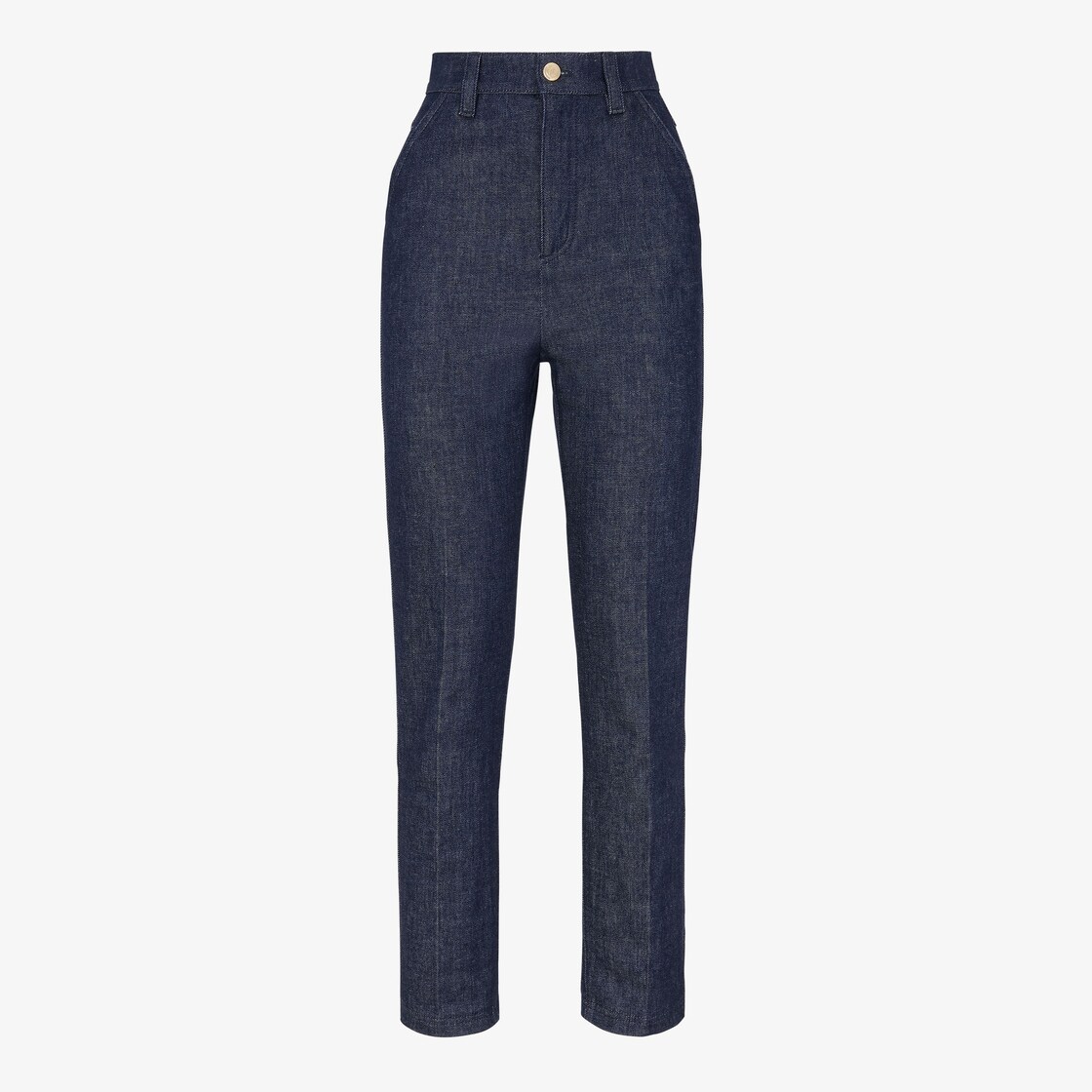 Straight-cut trousers. Side pockets. Concealed zip fastening. Made of dark blue cotton denim. Back pockets in matching-tone flocked fabric, with FF Karligraphy detail on the right pocket.
