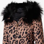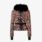 Short, padded ski jacket with fur-trimmed hood. Jersey cuffs and matching belt at the waist. Made of technical fabric with exclusive, all-over Fendi Leo motif print. Side zip pockets and front zip fastening. Technical fabric construction.