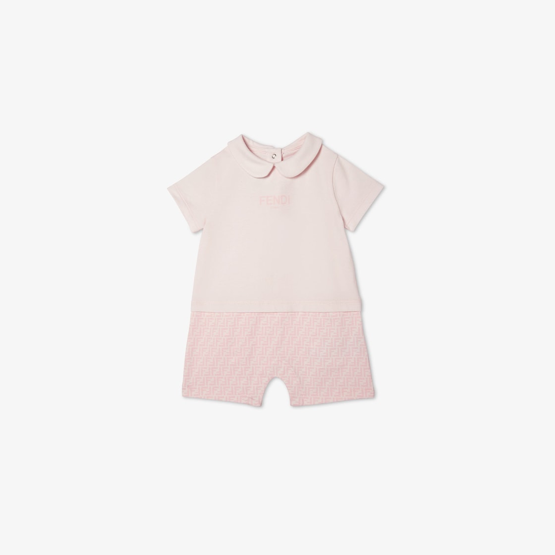 Short baby playsuit in pink stretch jersey with tone-on-tone Fendi embroidery on the front and all-over micro FF logo print on the trousers.