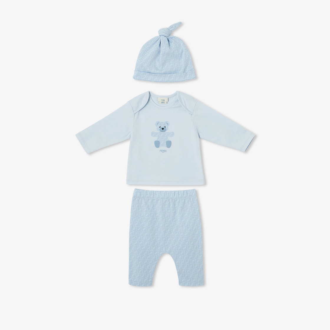 Baby set in light blue stretch jersey consisting of trousers with tone-on-tone all-over micro FF logo, long-sleeved T-shirt with light blue teddy bear print, and matching cap with micro logo. The set comes inside a practical jersey bag with a tone-on-tone Fendi logo.