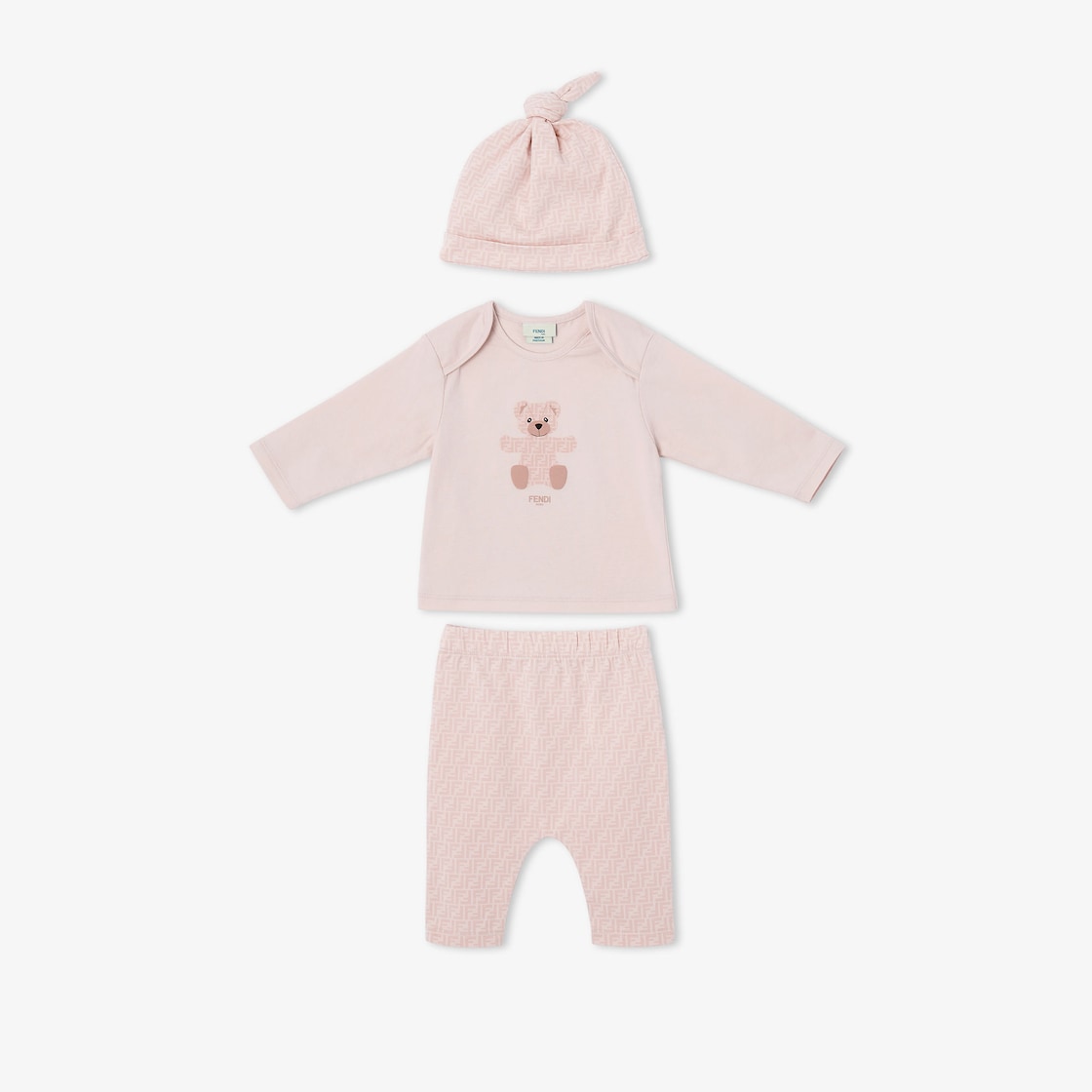Baby set in pink stretch jersey consisting of trousers with tone-on-tone all-over micro FF logo, long-sleeved T-shirt with pink teddy bear print, and matching cap with micro logo. The set comes inside a practical jersey bag with a tone-on-tone Fendi logo.