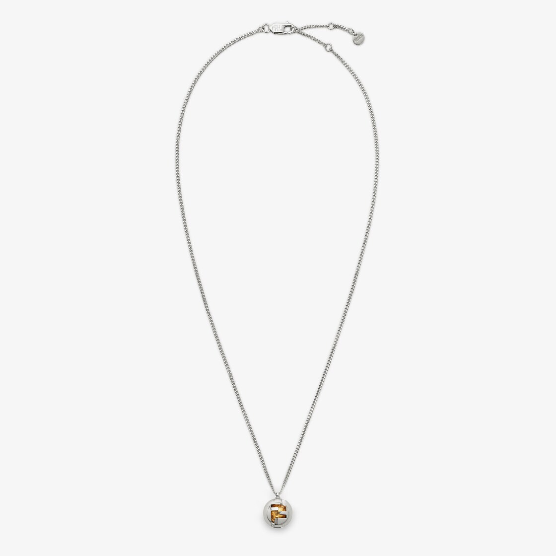 Thin necklace with chain link and Fendi Sphera pendant, made of metal with palladium finish. Decorated with Fendi Sphera pendant featuring inset gold-coloured details. Clip clasp.