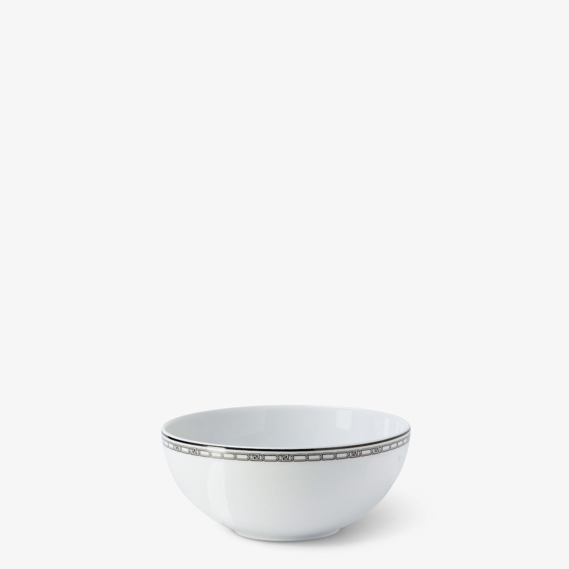 Asian bowl in the finest Limoges porcelain, decorated with the Fendi O'Lock Chain motif in white and black, with delicate gold-coloured accents. In conceiving the new Fendi Casa universe, Silvia Venturini Fendi redesigns the collection accessories combining the iconic elements of the fashion house with an Asian-style table setting. Italian design is expressed in the choice of quality materials, functionality and aesthetics in a harmonious balance of style and timeless elegance.