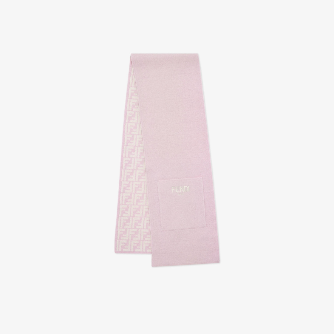 Knitted reversible junior scarf. Pink with pocket and Fendi embroidery on one side and all-over white and pink FF logo on the other.