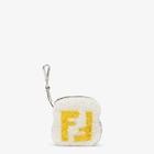 Bag charm made of white curly sheepskin with FF inlay in yellow and brown leather. The charm is distinguished by its unique toast-shaped design with a zipped compartment. Palladium-finish metalware with logo clip.