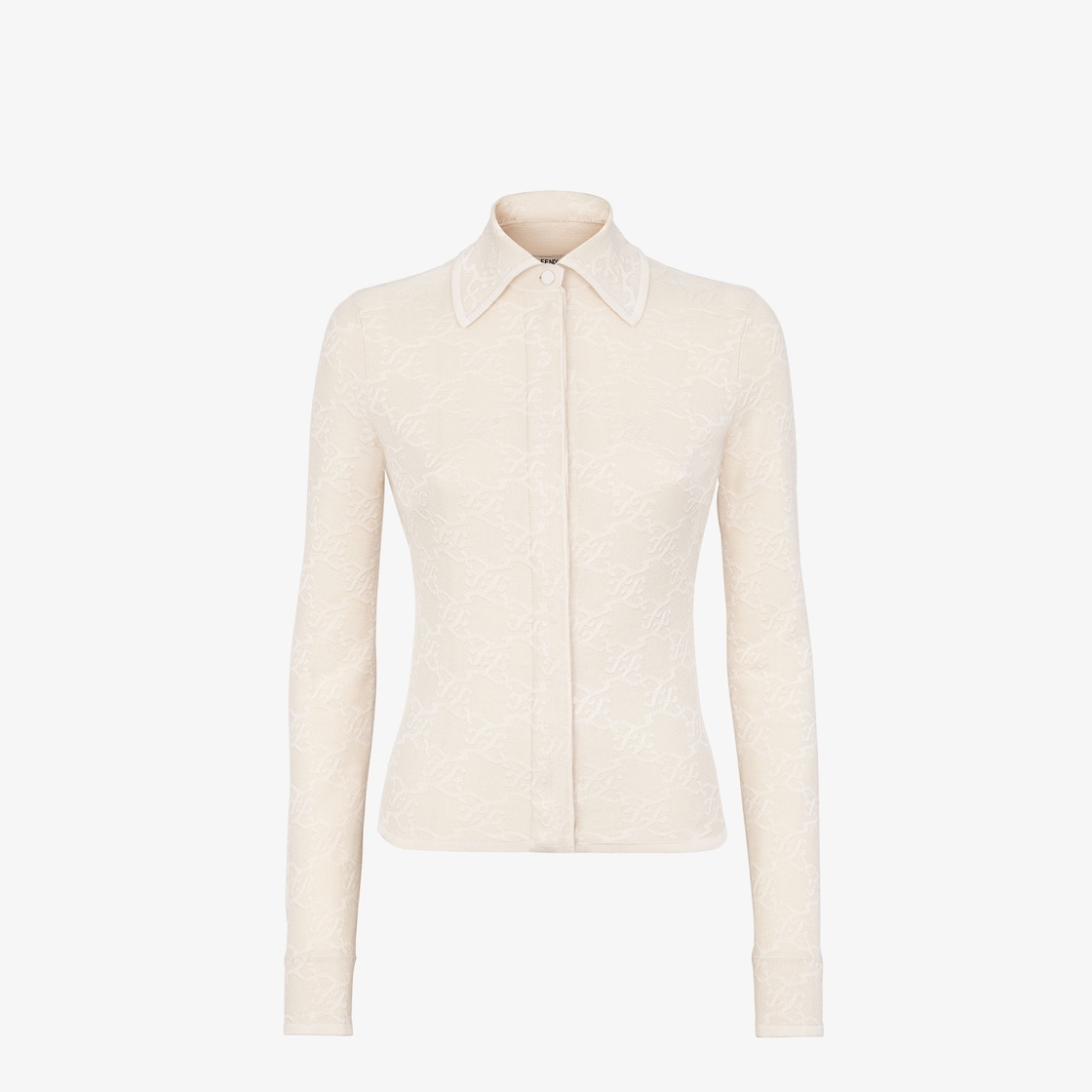 Long-sleeved close-fitting cardigan. Pointed collar and shirt cuffs. Concealed fastening. Made of white viscose with matching colour jacquard FF Karligraphy motif. Features a cotton lining that is soft on the skin.