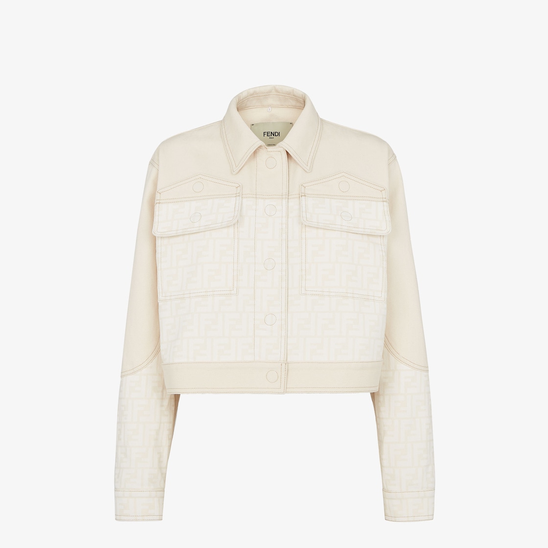 Укороченная куртка с отложным воротником и длинными рукавами. Карманы с накладными клапанами на груди. Потайная застежка. Модель из двухцветного денима в белых тонах со вставками из денима с узором FF того же оттенка. Строчка контрастного цвета.