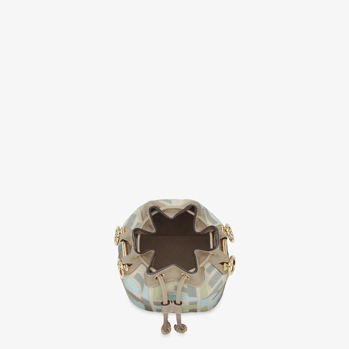 Модель из холщовой ткани на основе из смесового льна выполнена в цвете «зеленый чай матча» с легендарным объемным узором FF, вышитым разноцветной нитью. Отделка из телячьей кожи серо-коричневого цвета.