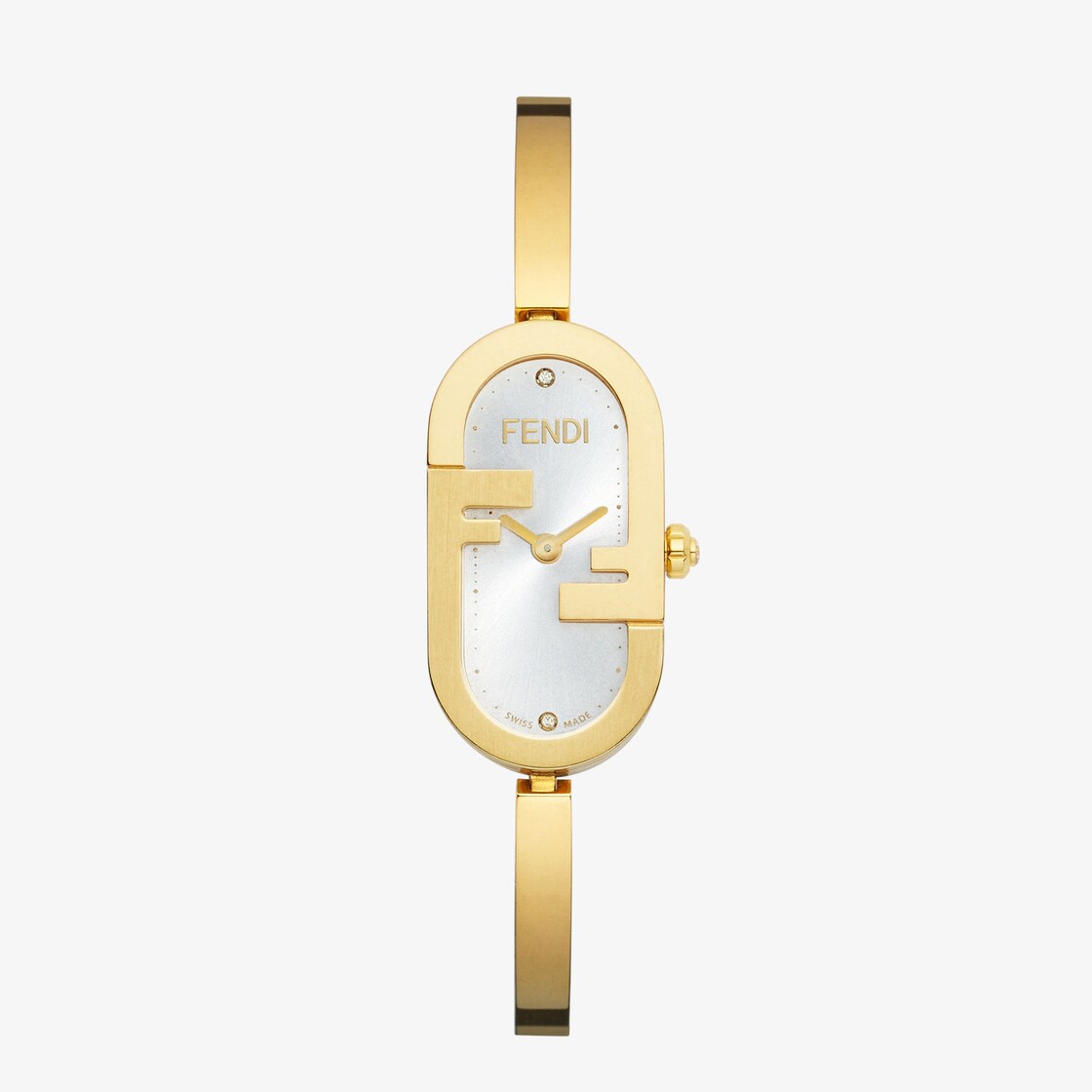 Овальный корпус золотистого цвета 14,80 x 28,30 мм, выполненный из полированной блестящей нержавеющей стали. Люнет в форме орнамента Fendi O'Lock. Заводная коронка с 1 инкрустированным бриллиантом около 0,02 карата. Циферблат серебристого цвета с отделкой «солнечные лучи», индексы с инкрустированными бриллиантами на 12 и 6 часов, около 0,01 карата. Минутные деления и заостренные стрелки золотистого цвета. Жесткий браслет из нержавеющей стали золотистого цвета шириной 3,50 мм с раскладной застежкой.