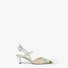 حذاء بشريط مطاطي خلفي بكعب متوسط من الأورجانزا (organza) مع طبعات باللون الأخضر الفاتح.