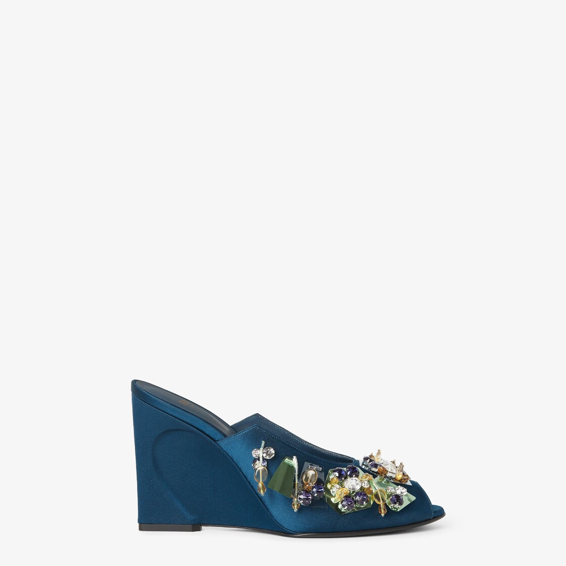 صندل مفتوح من الأمام بتصميم يلتف حول القدم وكعب عريض، مزين بعلامة Arco الأيقونية. مصنوع من الساتان (satin) باللون الأزرق البترولي، ومزين بتطريز ثلاثي الأبعاد يتكون من الخرز والكريستال بتأثير عاكس بألوان متباينة مختلفة. تفاصيل معدنية باللون الذهبي على الكعب، مع علامة Fendi محفورة.