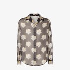 قميص بمقاس واسع ورقبة بولينج وأكمام طويلة. إغلاق بأزرار. يتميّز بطبقة مزدوجة من أورجانزا (organza) الحرير خفيفة الوزن. الطبقة الخارجية مزيّنة بعلامة Fendi Bouquet بالألوان الأسود والأبيض والأصفر، والطبقة الداخلية تتميز بعلامة مخططة رأسية بالألوان نفسها.