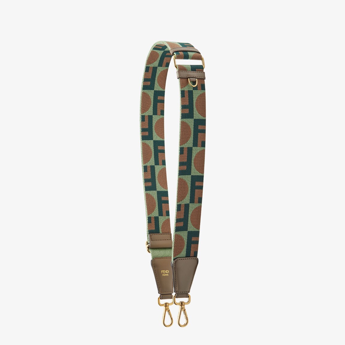 حزام كتف طويل قابل للتعديل بمشبك إغلاق مزدوج، يمكن استخدامه مع أي حقيبة ذات مشابك إغلاق. مصنوع من الجاكار بنقش ويب باللون الأخضر مع علامة Fendi Dots التي تجمع بين علامة FF الأيقونية ونقاط مستوحاة من فن الآرت ديكو بألوان مختلفة. تفاصيل من الجلد باللون الرمادي الفاتح. زينة معدنية باللون الذهبي.