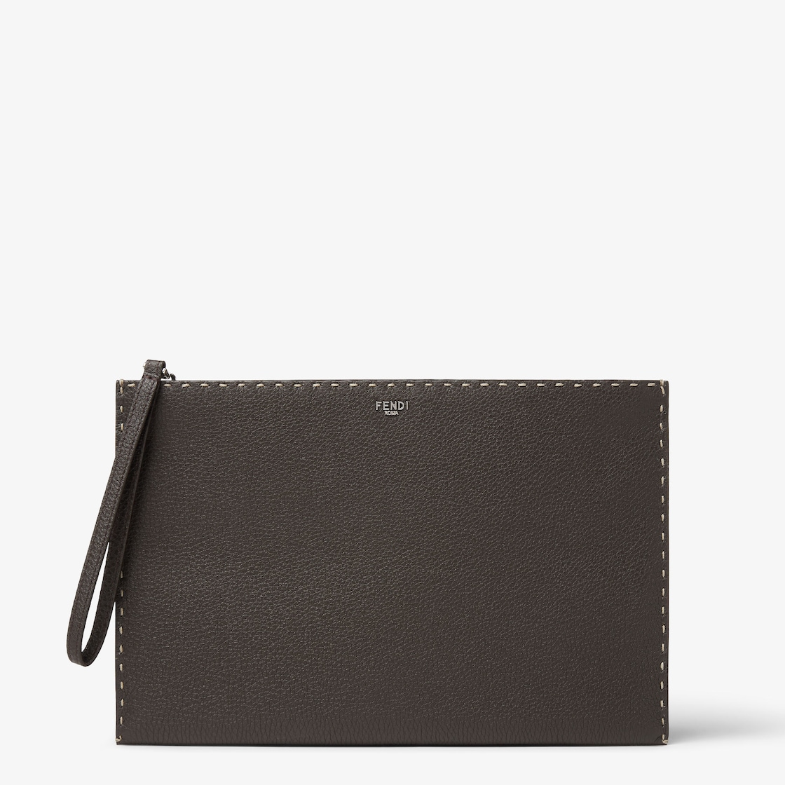 حقيبة مسطّحة بحجم متوسط مع سحّاب. مصنوعة من جلد العجل كويو رومانو (Cuoio Romano) باللون البني الداكن، مع 196 درزة يدوية علوية كبيرة، رمز لحرفية Selleria الأيقونية المتوارثة عبر أجيال من حرفيي فندي منذ عام 1925. مزيّنة بحروف Fendi Roma معدنية بلمسة نهائية من البلاديوم (palladium). يتميز القسم الداخلي بختم Fendi Selleria من الجلد المخيّط يدوياً.