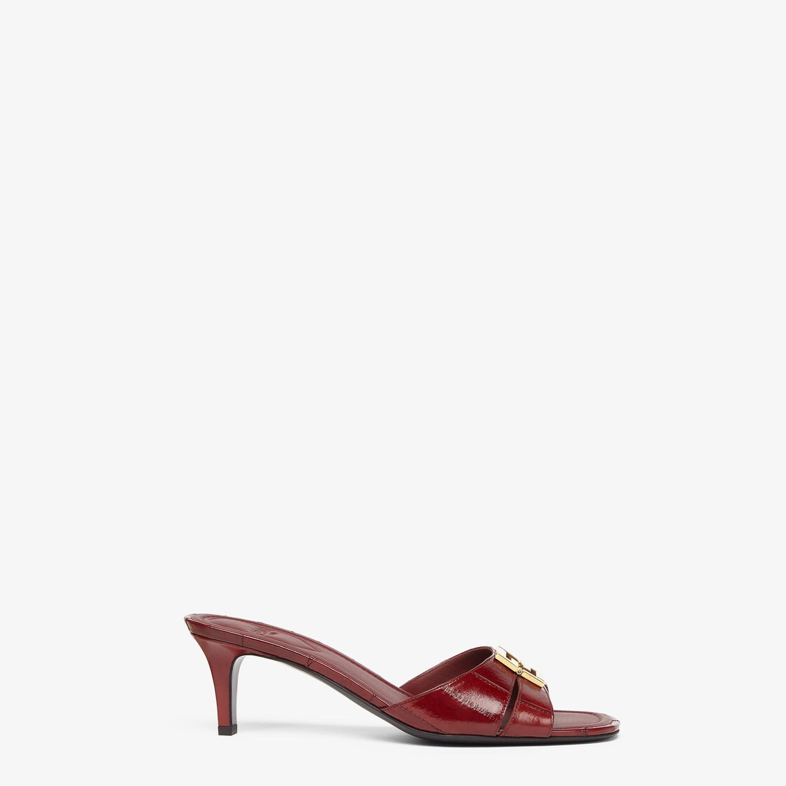 صندل سهل الارتداء بمقدمة مربّعة وشريطين عريضين.يتميز بعلامة FF معدنية بتصميم مميز ومفصلة في الوسط، ما يجعله مريحاً في المشي.مصنوع من جلد سمك الجرّيث (hagfish) اللامع باللون الأحمر.زينة معدنية باللون الذهبي.