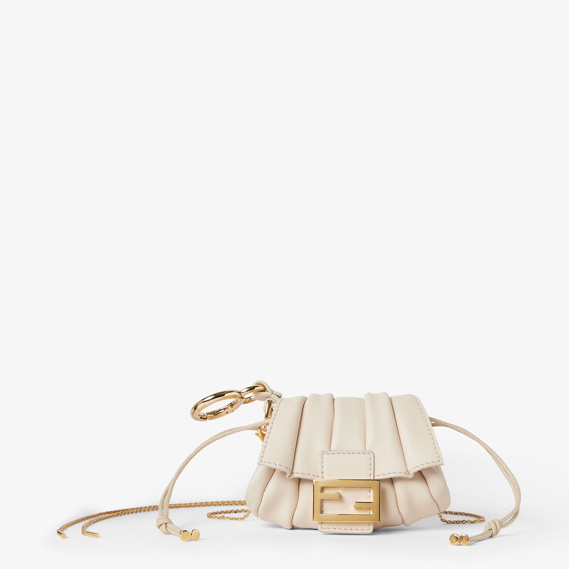 حقيبة Mamma Baguette الأيقونية بحجم نانو. تتميز بمشبك FF وإغلاق مغناطيسي تحت الفتحة. إغلاق برباط مع أربطة وتفاصيل معدنية مخصّصة. يمكن تعليق الحقيبة مثل قلادة صغيرة بمشبك الإغلاق أو ارتداؤها على الكتف أو cross-body بفضل حزام الكتف على شكل سلسلة القابل للتعديل. مصنوعة من جلد العجل المثني لتشكيل ملمس ناعم وثلاثي الأبعاد يذكّرنا بعلامة Pequin المخططة الأيقونية. زينة معدنية باللون الذهبي.