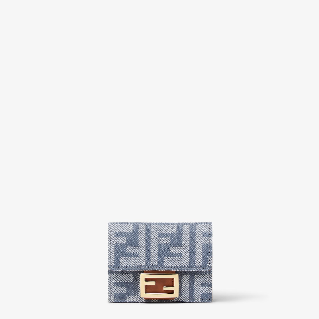 محفظة Baguette بثلاث طيّات بحجم صغير تحتوي على قسم داخلي كبير للأوراق النقدية، وثلاث حاملات بطاقات مخفية، وجيب خارجي للعملات المعدنية يُغلق بزر كبس. مصنوعة من الجاكار مع طباعة FF بتأثير الدنيم بدرجات اللون الأزرق. القسم الداخلي من جلد العجل باللون البني. زينة معدنية باللون الذهبي.