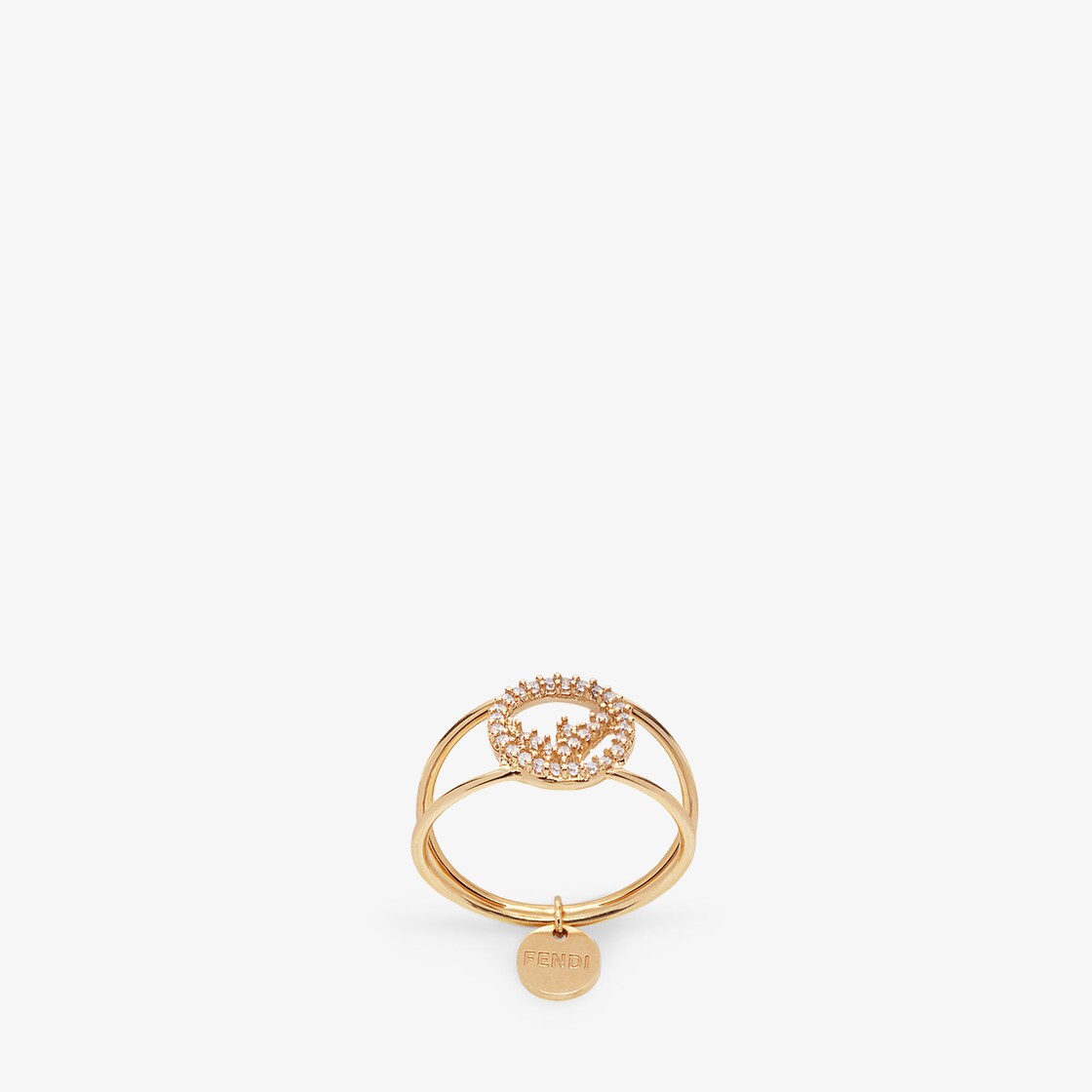 خاتم بشعار F is Fendi مع دلاية مُخصصة بحروف فندي. مصنوع من معدن مطلي باللون الذهبي. تصميم مزين بالكريستال الطبيعي.
