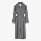 معطف متوسط الطول مع رقبة شال كبيرة وحزام متناسق حول الخصر. جيبان جانبيان. مصنوع من قماش مزدوج من الصوف باللون الرمادي. تتميّز البطانة بعلامة FF باللون الرمادي الفاتح.