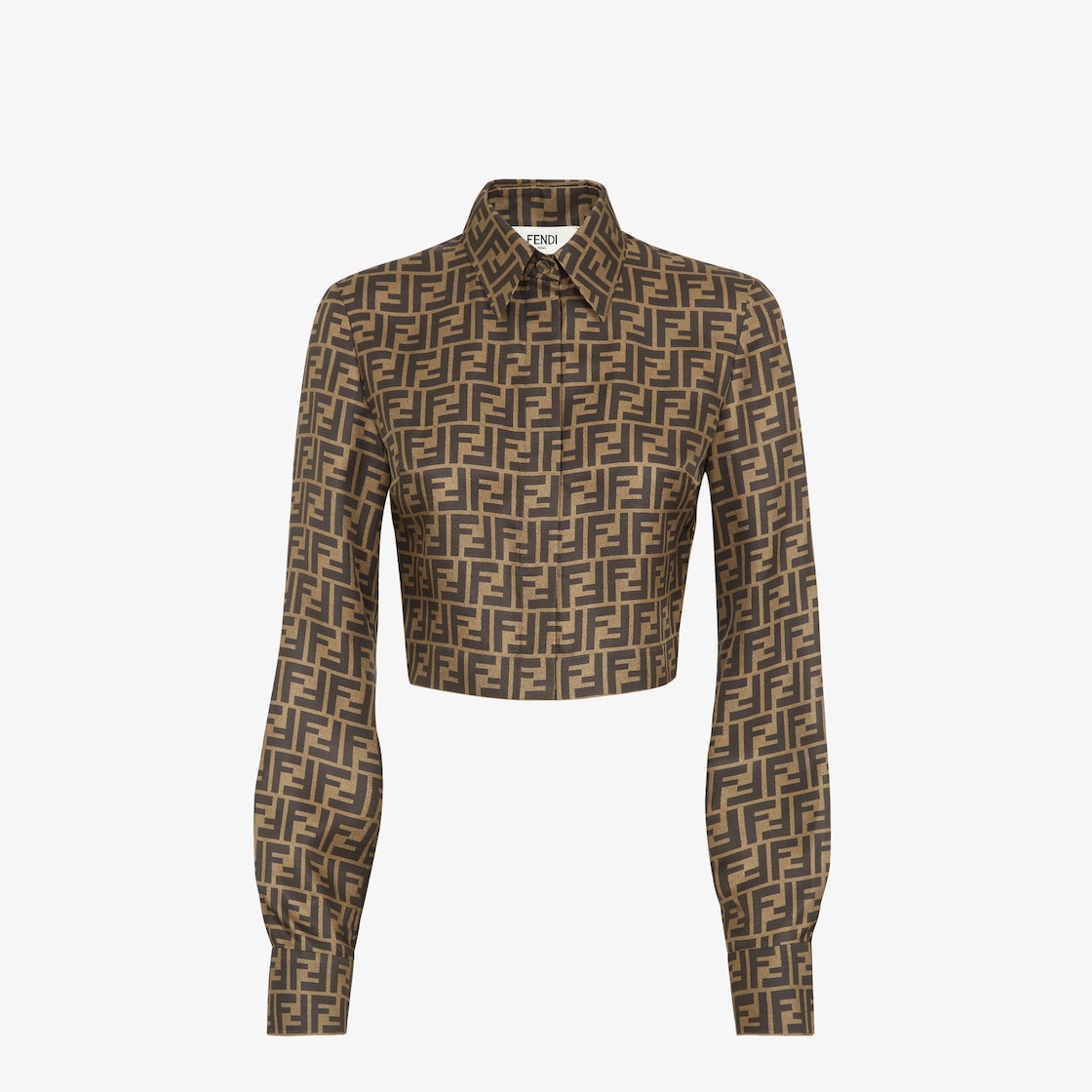 توب قصير برقبة قميص وأكمام طويلة. إغلاق مخفي على الجهة الأمامية. مصنوع من النسيج القطني (twill) الحرير مع طبعة علامة FF الأيقونية تغطيه بالكامل باللون البني.