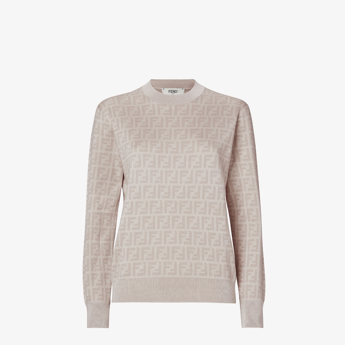 كنزة بمقاس عادي ورقبة مدوّرة وأكمام طويلة.مصنوعة من نسيج الصوف والحرير مع علامة FF الأيقونية من الجاكار عليها بالكامل باللون الوردي.مزيّنة بأطراف مضلّعة.
