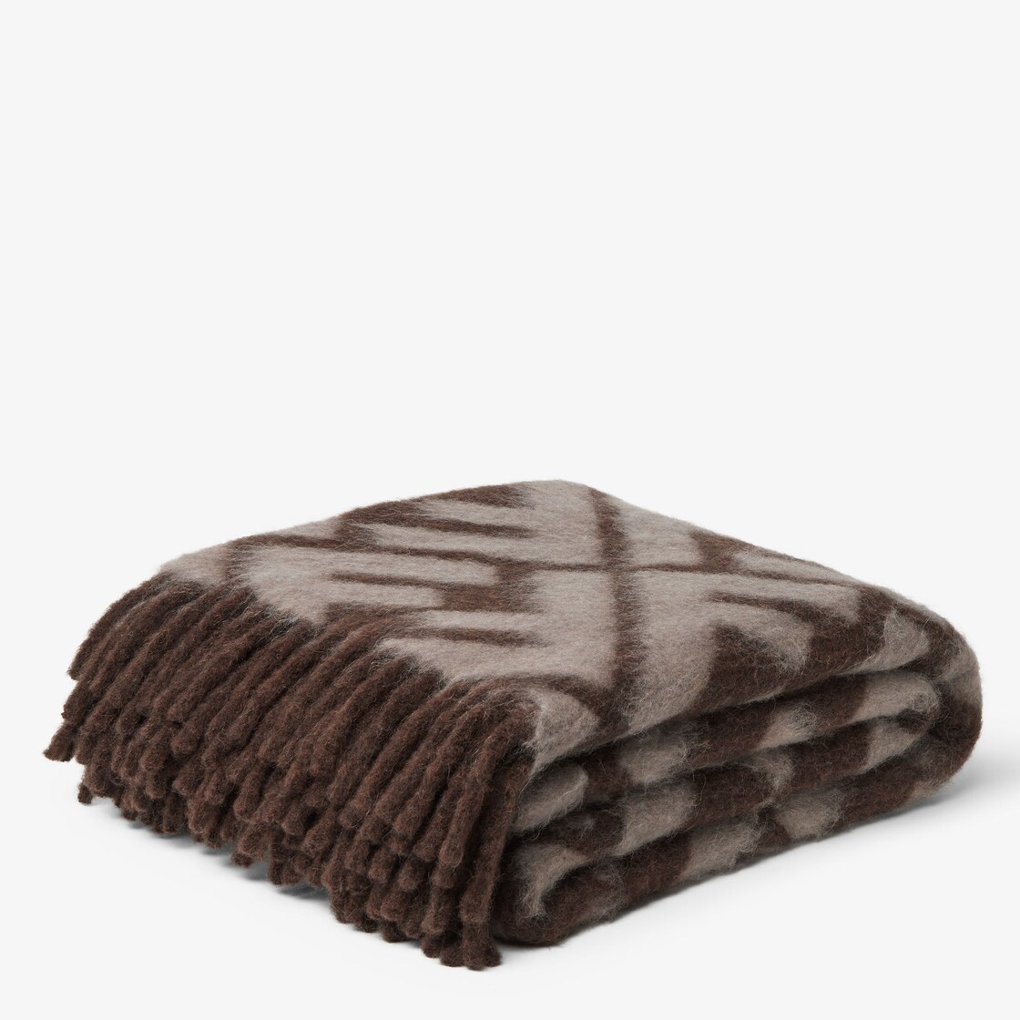 Two-tone soft alpaca and wool fabric square throw with FF motif, created in natural dark brown and beige tones. Finished with a woven fringe edge. Designed by Karl Lagerfeld in 1965, the FF logo is used as a graphic and decorative element, consolidating the close relationship between furniture and the world of fashion. Exquisite workmanship of precious materials make it exceptionally soft and luxurious, while the iconic graphics transform it into a true item of design.
