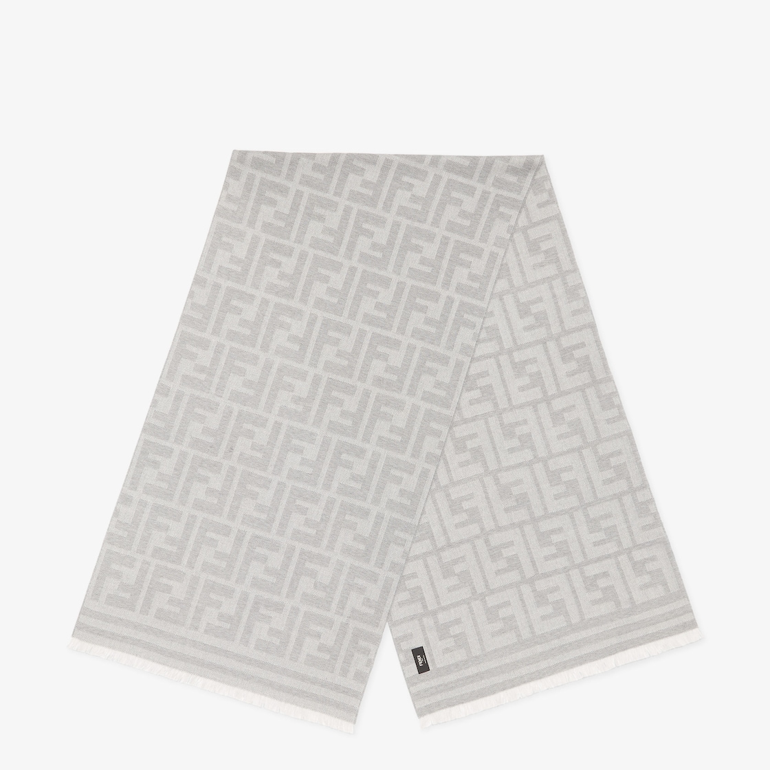 Rectangular scarf made of a pure wool FF jacquard in two different grey tones. Finished with fringes at the hem.