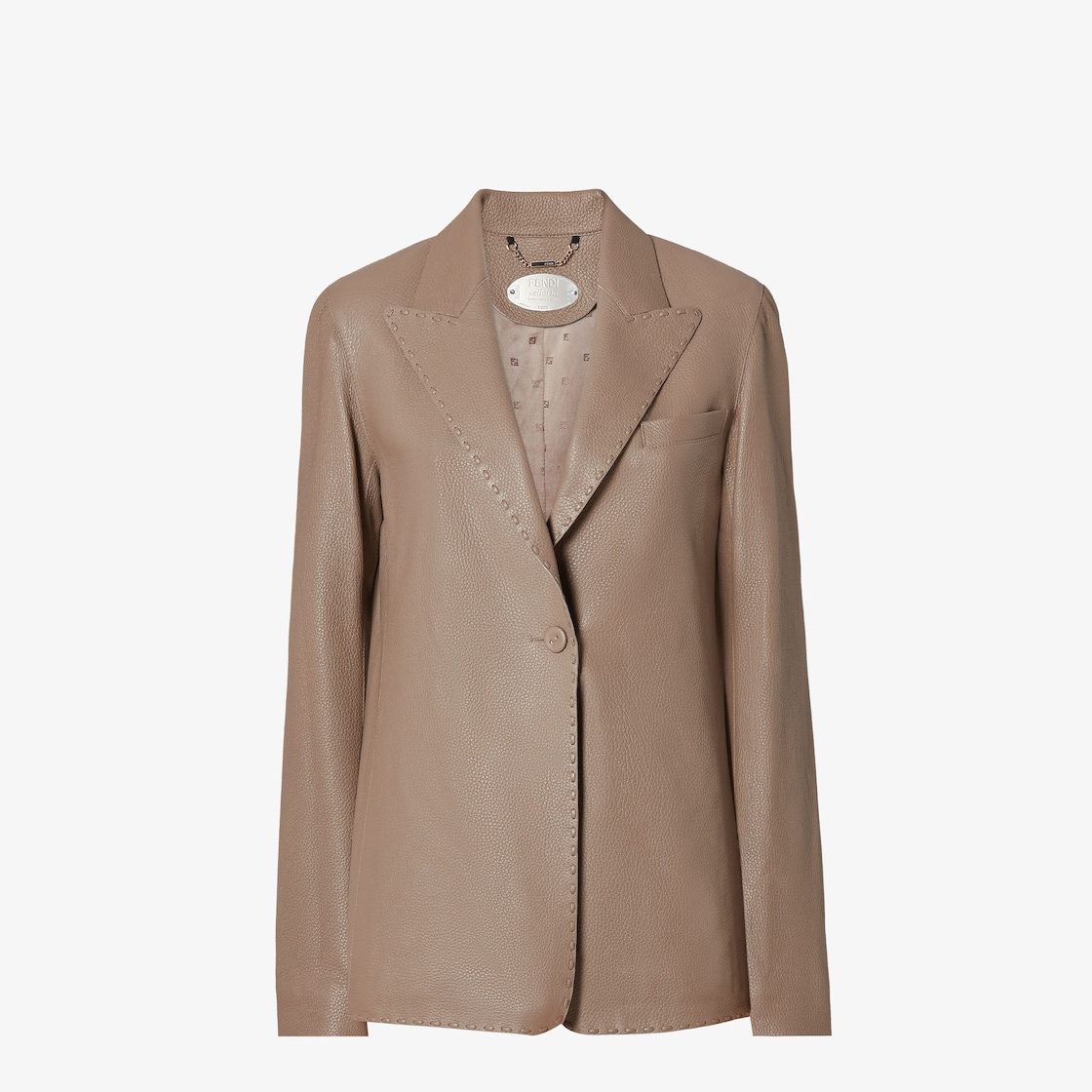 Straight-cut jacket with lapel collar and long sleeves. Welt pocket on the chest and centre slit at the back. Lined. Made of soft, beige grained leather. Embellished with raised Selleria micro stitching and fastened with iconic Peekaboo metal twist lock detail on the cuff.