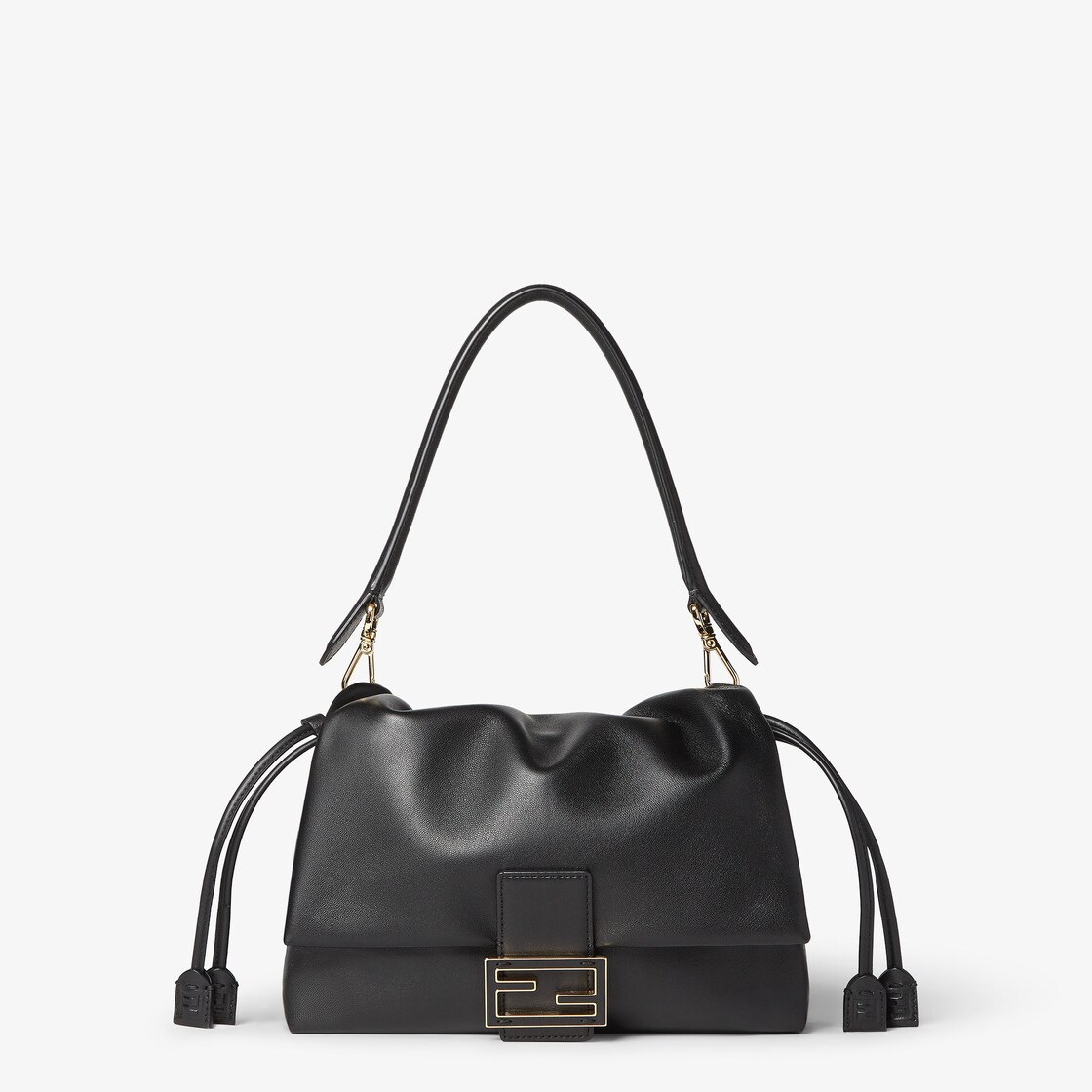 Made of soft, black nappa leather embellished with an oversized metal FF clasp with tone on tone leather insert.