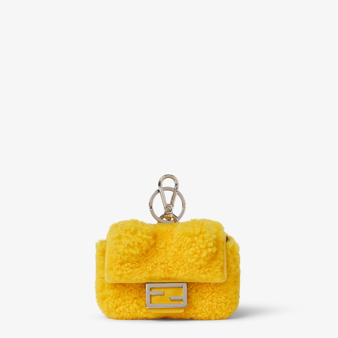 Nano version of the iconic Baguette bag, with flap and FF clasp with magnetic closure. The snap hook allows it to be attached to larger bags or belts. Lined in tone-on-tone leather. Made in yellow curly shearling with two soft “teddy ears” that decorate the flap. Palladium-finish metalware.