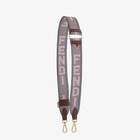 Long adjustable shoulder strap with double snap hook, to use in combination with any bag with hooks. Made pf brown, pink and light blue jacquard fabric with Fendi lettering. Embellished with mahogany brown leather details. Gold-finish metalware.
