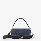 Featuring a front flap, magnetic button clasp, one internal compartment entirely lined with blue denim-effect FF jacquard and gold-finish metalware.