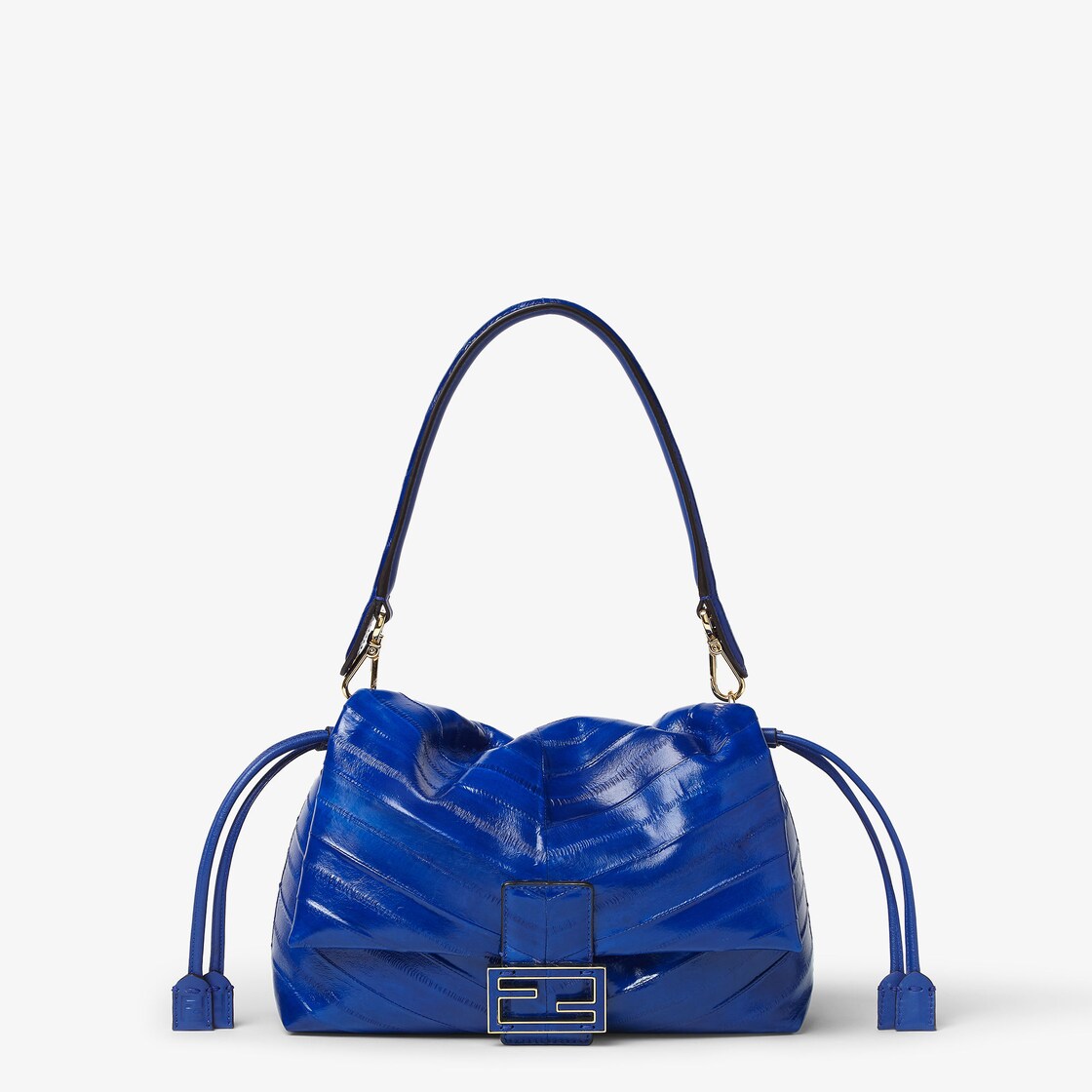 Made of premium electric blue hagfish leather with a glossy finish, inlaid to create a chevron motif. The natural characteristics of the leather make each bag a unique piece. Completed by the FF clasp with a tone-on-tone leather insert.