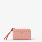 Peekaboo card case central zipped compartment and front pocket. The interior is organised with a banknote compartment and clip to attach keys. Made of powder pink Cuoio Romano leather with 8 hand-sewn, contrasting topstitches, an emblem of the iconic Selleria stitching handed down through generations of Fendi artisans since 1925. Palladium-finish metalware and metal FENDI logo.