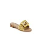 Wide-band slides. Made of brown nappa leather embellished with openwork embroidery and scalloped edges, finished with contrasting pink yarn. Tone on tone FF Baguette motif with scalloped edges and pink yarn embroidery.