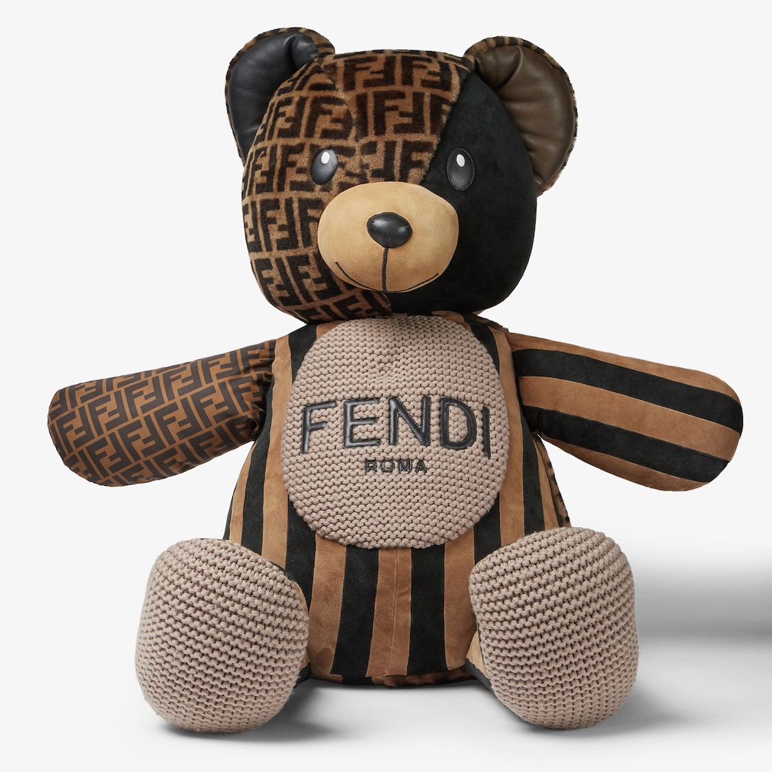 Edoardo oversized collectable patchwork teddy bear. The teddy bear’s head is made of shearling printed with the FF logo and leather eyes and nose. Jacquard-effect FF nylon for the arm and suede Pequin motif for the rest of the body. Wool and leather motif for tummy and paws. Mink tail. All in brown and beige.