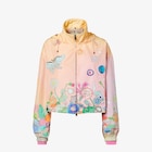 Short windbreaker jacket with hood and drawstring edge. High collar and low-cut set-in long sleeves with elasticated cuffs. Side pockets. Zip fastening with double slider. Part of the “Fantastic Fendi Future” capsule collection designed in collaboration with Japanese artist Aya Takano and made of nylon with the Fantastic Flowers print in pink and yellow tones. Palladium-finish metalware.