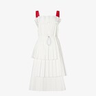 Midi bustier dress with asymmetric panels on the skirt and adjustable drawstring at the front waist. Cut-out detail on the back with elastic strap and shoulder straps. Back zip fastening. Made of white faille, crafted all-over with a flat-pleat motif. Contrasting red shoulder straps and back elastic.