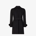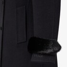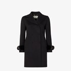 Straight-cut and feminine, double-breasted midi coat. Lapel collar and long sleeves. Side pockets and centre-back vent. Covered button fastening in matching tone. Made of black wool double-sided fabric. Lining customised with a grey FF motif. Embellished with black mink cuff straps and matching Fendi logo embroidered on the left wrist.