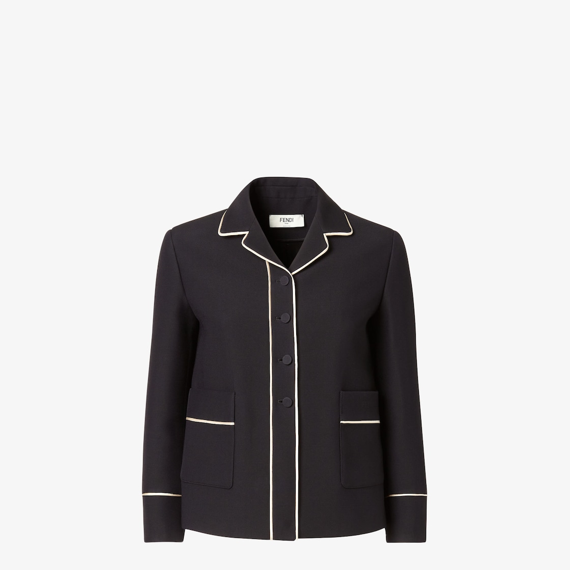 Tailored jacket with pyjama collar and long sleeves. Patch pockets on the front. Fastened with four buttons covered in a matching tone. Lined. Made of black silk and wool. Finished with contrast piping.