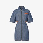 Short dress fitted at the waist. Shirt collar and short sleeves. Patch pockets on the chest, side pockets, and Patch pockets on the back. Fastening with full-length double-slider zip. Made of navy blue cotton chambray denim with contrasting stitching. Embellished with a tan leather oversized Fendi patch on the left breast pocket and leather straps with a metal logo button at the waist. Gold-finish metalware.