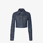 Short jacket with shirt collar and long sleeves. Patch pockets with flap on the front. Fastening with concealed press studs. Made of dark blue denim with all-over quilted FF motif. Contrasting tobacco-coloured stitching. Embellished with a leather Fendi Roma patch at the back of the collar.