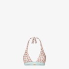Triangle bikini top with self-ties behind the neck and hook at the back. Made of Lycra® with oversized FF Waves motif, inspired by an archive design and interpreted in light pink, brown and light blue. Matching Pequin pouch with wrist strap and Fendi patch.