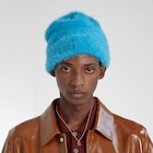 Beanie with turned-up brim. Made of turquoise long-pile faux fur. Embellished with tone-on-tone Fendi Roma fabric patch on the front.