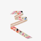 Two-sided wrappy. Can be worn around the neck, knotted at the wrist or used to accessorise a bag with a touch of colour. Made of silk. The Sunny Side Flowers motif reinterprets the floral theme of the collection in a graphic style. One side is printed in bright pink, yellow and blue, the other has a gold-coloured chain motif.