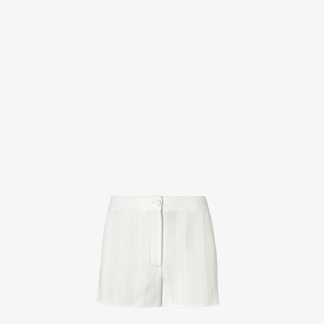 Straight-cut shorts with side pockets. Covered button and zip fastening. Made of white viscose yarn with a shiny-matte effect that recreates the iconic Pequin motif. Fendi logo embroidered on left-side hem.