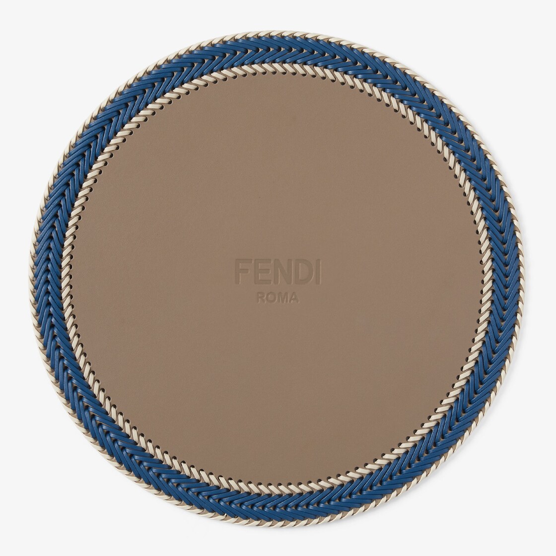 Dove grey nappa leather placemat with hand-woven border in ultramarine blue and natural tones. Ideal combined with the tableware sets, this elegant placemat is decorated with a central Fendi Roma logo. A union of craftsmanship and design, the Fendi Casa accessories range offers unique and sophisticated objects created to make every dining experience special.