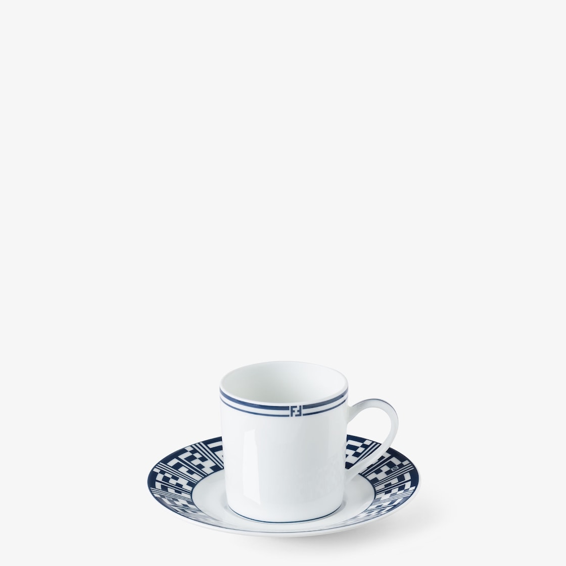 Coffee cup made of the finest white Limoges porcelain, with an ultramarine blue FF motif border decoration. The ritual of tea and coffee has been reimagined with inspiration from the brand's archives, enhancing the saucer with an elegant graphic motif in deep ultramarine blue that abstractly reinterprets the iconic FF logo. The style is adorned with micro FFs, infusing it with a dynamic energy that stems from meticulous attention to detail. Designed for luxurious yet relaxed table settings, it is perfect for enhancing moments of sharing with sophisticated quality.
